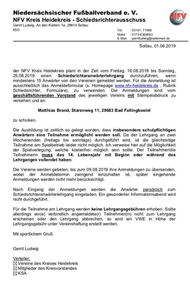 An den Wochenenden 16.08.-18.08. und 23.08.-25.08. findet im Heidekreis ein Schiedsrichterlehrgang statt.