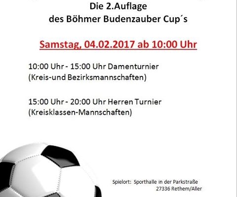 Der SV Böhme lädt ein! Auch in diesem Jahr findet wieder unser Budenzauber Cup in der Rethemer Sporthalle statt. Bei Kaffee, Kuchen und anderen Leckereien wartet Fussball satt auf die Zusch… Zum Artikel