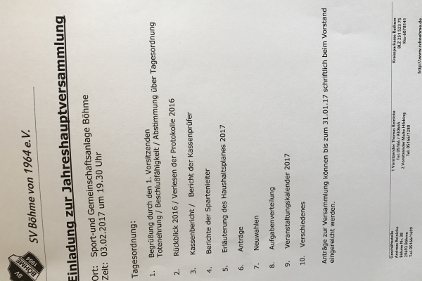 Hallo liebe Vereinsmitglieder, das sportliche Jahr ist wieder mal vorbei und natürlich steht auch nun wieder die Jahreshauptversammlung am 03.02.17 an. Der Vorstand würde sich deshalb nat… Zum Artikel