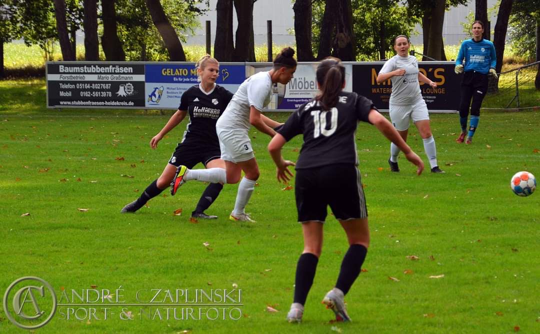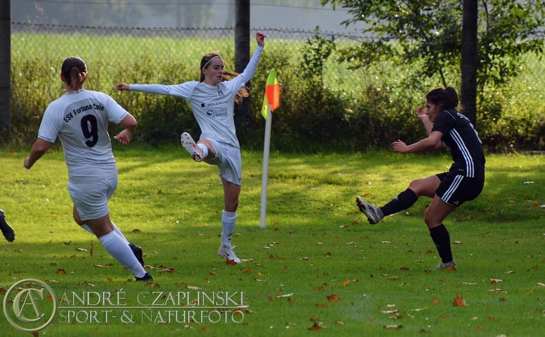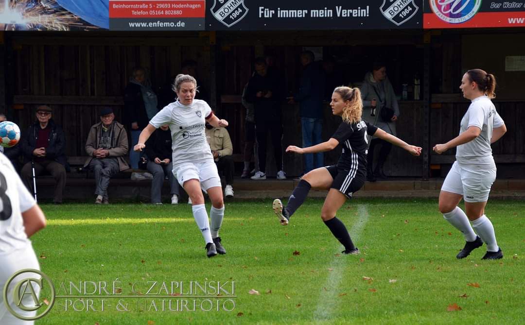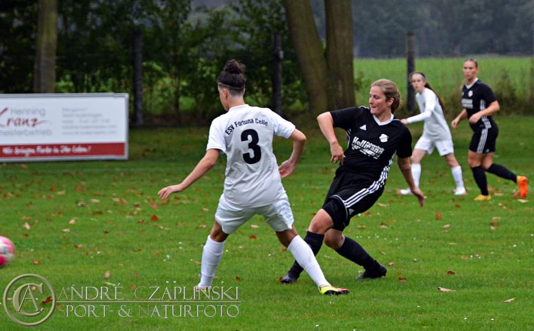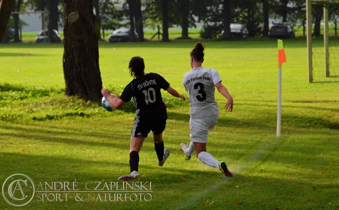 Fast die gesamte erste Halbzeit wurde von beiden Mannschaften eher „abgetastet“, ohne dass beiden Seiten deutlich erkennbare gute Offensiv-Aktionen vortrugen. Die erste richtige Angriffsaktion der Gäste in der 35 Minute brachte jedoch auch den ersten gefährlichen ESV-Abschluss, der dann auch mit dem Führungstreffer abgeschlossen wurde. Der erste richtige Fehler in der Böhmer Abwehrarbeit wurde gleich schmerzlich bestraft., dieser Spielstand blieb dann bis zum Seitenwechsel bestehen. Nun wurde die Aufgabe für uns merklich schwerer, aber man gab sich nicht auf und versuchte alles, um zum Ausgleich zu kommen. Gerade die letzten 20 Minuten entwickelten sich zu einer Phase, in dem der SVB deutlich und auch mit aller möglichen Physischen Kraft den Willen zeigte, den Spielstand auszugleichen. Wir übernahmen von Minute zu Minute mehr Spielanteile und gerade in diese Drangphase setzten die Gäste aus Celle „einen schmerzlichen Stich“, mit dem zweiten Treffer, der eigentlich bereits die Vorentscheidung bedeutete. Unsere Mannschaft gaben aber nicht auf und wollte, zumindest für die eigene Moral und für ihre Fans, nochmal „alles reinhauen“. Diese Bemühungen wurden dann auch durch einen Doppelschlag in Minute 77 + 79, durch Treffer von Toni und Kamilla, belohnt. Celle war durch dieses Aufbäumen und die beiden Gegentreffer sichtlich überrascht und sah in den letzten Spielminuten weitere Angriffe und auch einige beste SVB-Einschußmöglichkeiten, inclusive eines Lattentreffers von der gerade eingewechselten Nayomi, auf sich zukommen. Nayomi, die nach längerer Verletzungspause erstmals wieder auf den Platz stand, hatte mit ihren ersten Ballkontakten durch 2 Weitschüssen fast die Führung erzielen können, was wäre das für ein Comeback. Das 3‘te Tor, um dieses Spiel noch vollständig zu drehen, viel aber aus unserer Sicht dann leider nicht mehr, aber letztlich wirkte auch dieser Punktgewinn, vor allem durch den Einsatz und die Willenskraft zum Ende des Spiels, positiv auf unsere Spielerinnen, man zeigte, dass man auch bei den derzeitigen Problemen, mit einem Top-Team der Liga mithalten kann. Dieses Ergebnis sollte auch Zuversicht für die nächste schwere Aufgabe am kommenden Wochenende geben, da reisen die Böhmerinnen am Samstag zu einem weiteren „Schwergewicht“ der Liga, zum Tabellenführer vom SV Eintracht Lüneburg II.