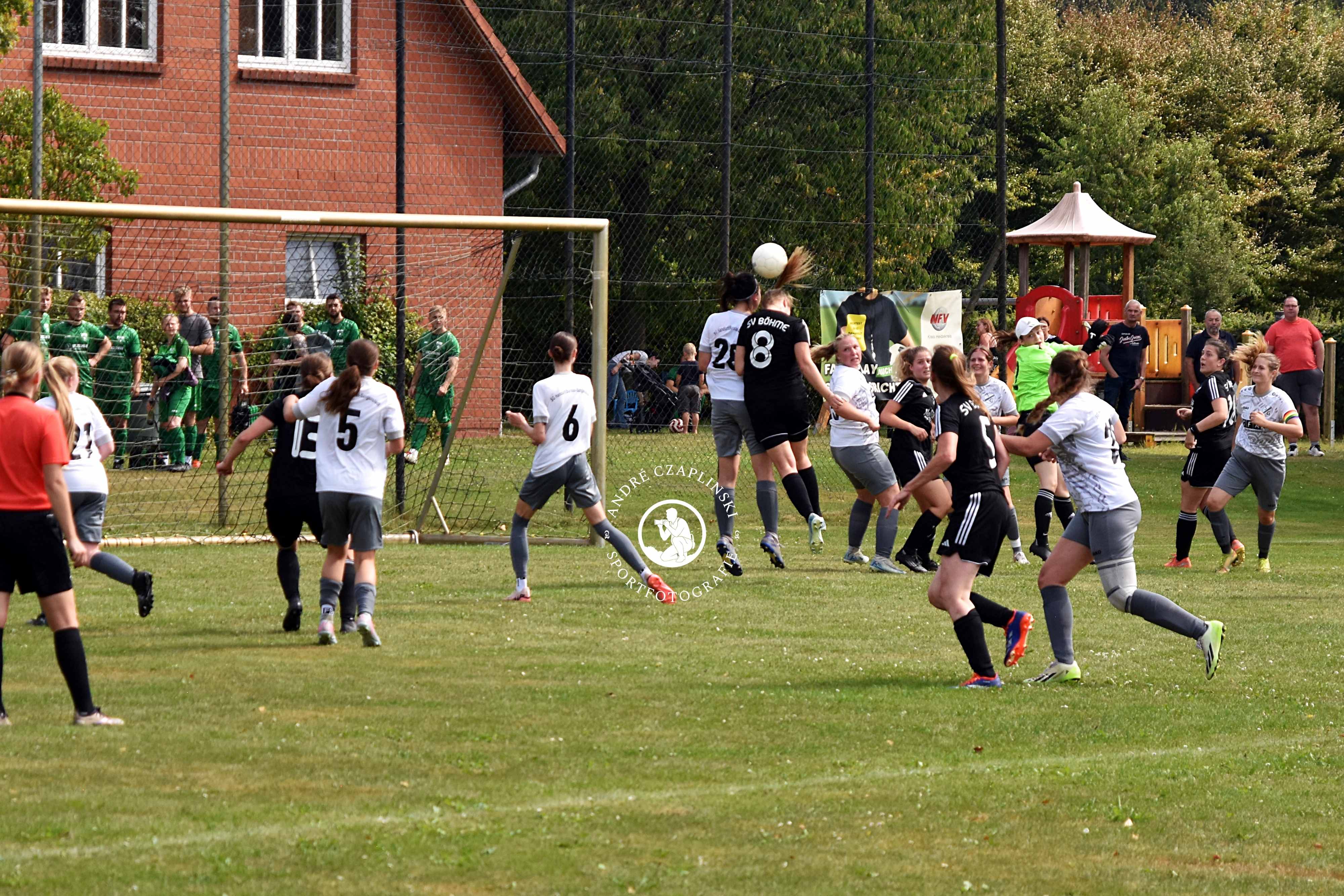 In der Halbzeitpause haben die Trainer deutlich angesprochen, dass dieses Verhalten unserer Spielerinnen nicht zu akzeptieren ist und das das gesamte Team deutlich konzentrierter und wieder voll fokussiert auf das Spiel und den Gegner auf den Platz gehen muss. Nach dem Seitenwechsel wurde dieses auch besser umgesetzt und die Gäste wurden immer mehr in die Abwehrarbeit gedrängt. Sie konnten im gesamten 2. Durchgang nur einen gefährlichen Angriff vortragen, der jedoch in der 65 Minute auch erfolgreich zur erneuten Führung abgeschlossen wurde. Danach ging es erneut nur in eine Richtung, auf das Gästetor. In der 76 Minute köpfte Janka dann, nach einer Ecke von der rechten Seite durch Joanna Au, den hoch verdienten Ausgleichstreffer, da hat eine Eckballvariante mal richtig gut geklappt. Danach wurde der Böhmer Druck weiter aufrechterhalten, gute Chancen wurden herausgespielt, aber letztlich fehlte dann der entscheidende Abschluss, das Glück und leider war auch das Tor-Alu gegen eine Führung für unsere Mannschaft. Das Gästeteam konnte in den letzten 20 Spielminuten nur noch mit allen Mitteln versuchen, einen Rückstand zu vermeiden, was dann leider, aus Böhmer Sicht, auch geschafft wurde. Abschließend ist zu resümieren, das Böhme heute 2 Punkte liegengelassen hat, jedoch stimmt der Einsatzwille, die Spielfreude und die geschlossene Mannschaftsleistung, nur die Chancenausbeute muss deutlich verbessert werden.