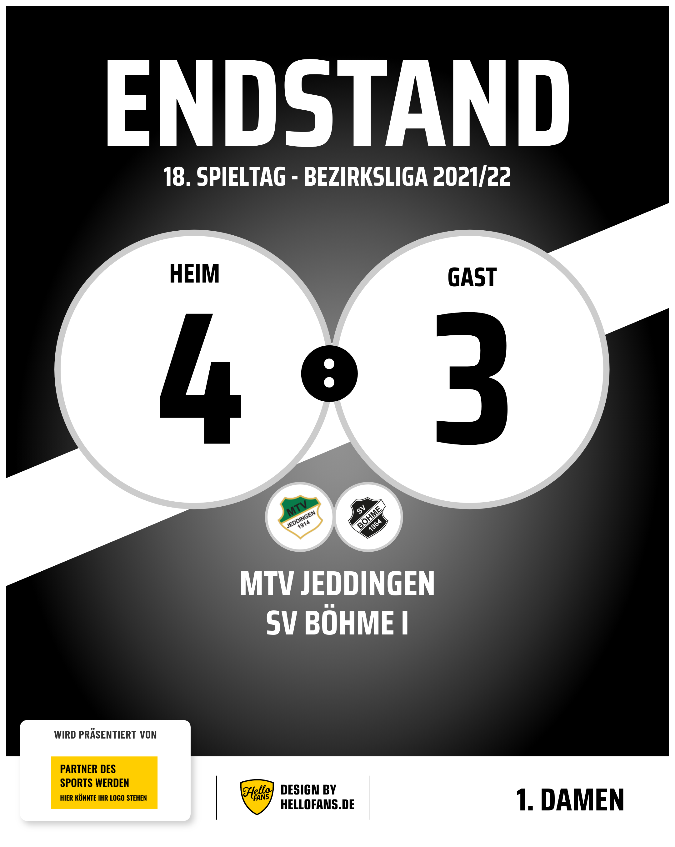 Kurz vor dem Pausenpfiff fiel noch der Anschlusstreffer des MTV. Im zweiten Durchgang entwickelte sich dann ein recht zerfahrenes Spiel, mit vielen Unterbrechungen und Toren, die eher zufällig, auch durch ungeplante und zum Teil glückliche Aktionen, fielen. Durch einen Doppelschlag innerhalb von fünf Minuten drehte Jeddingen das Spiel. Die Schlussphase wurde dann äußerst spannend, da der Böhmer Ausgleich durch Inga in der 88. Minute und die erneute MTV-Führung in der 90. Minute fielen.