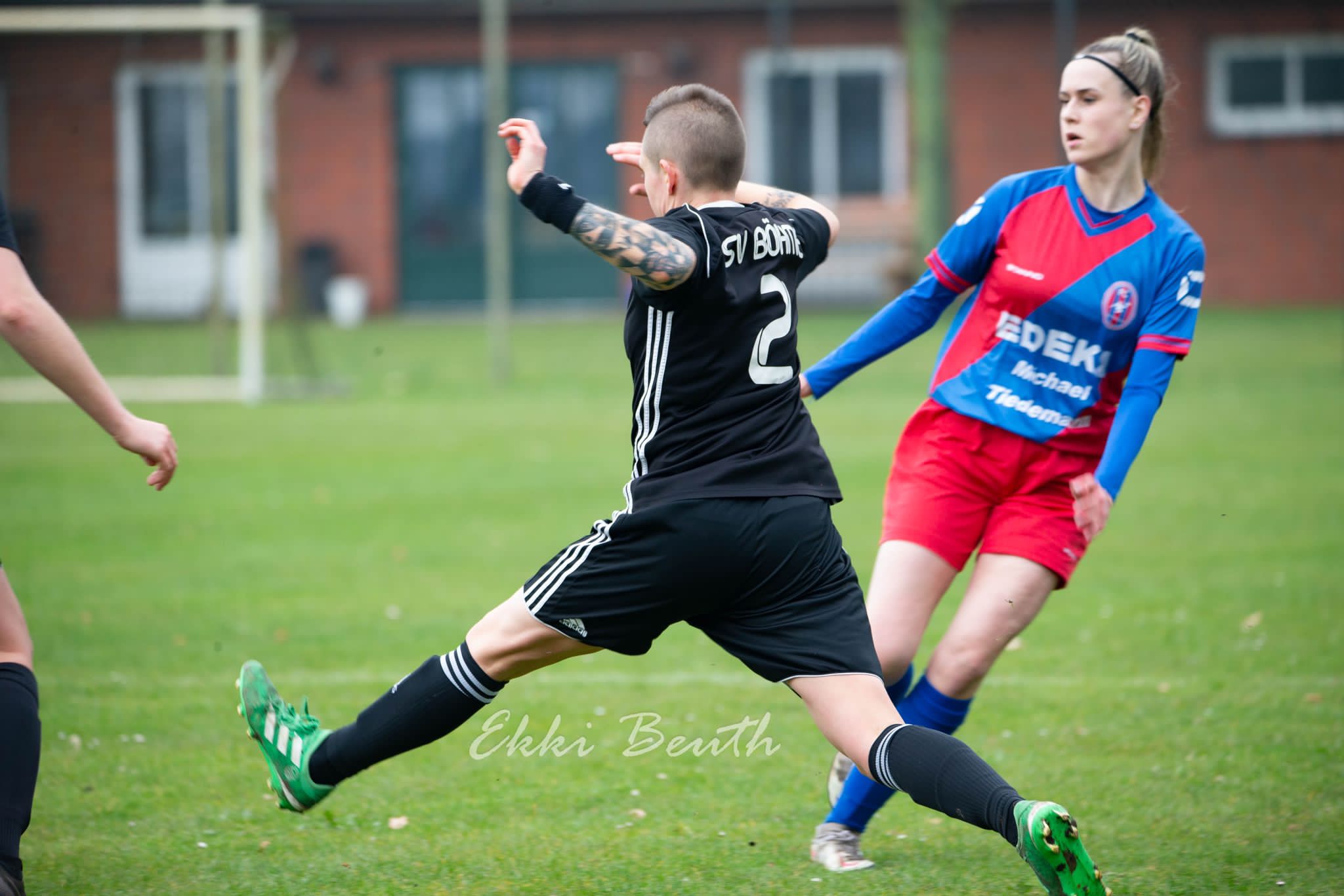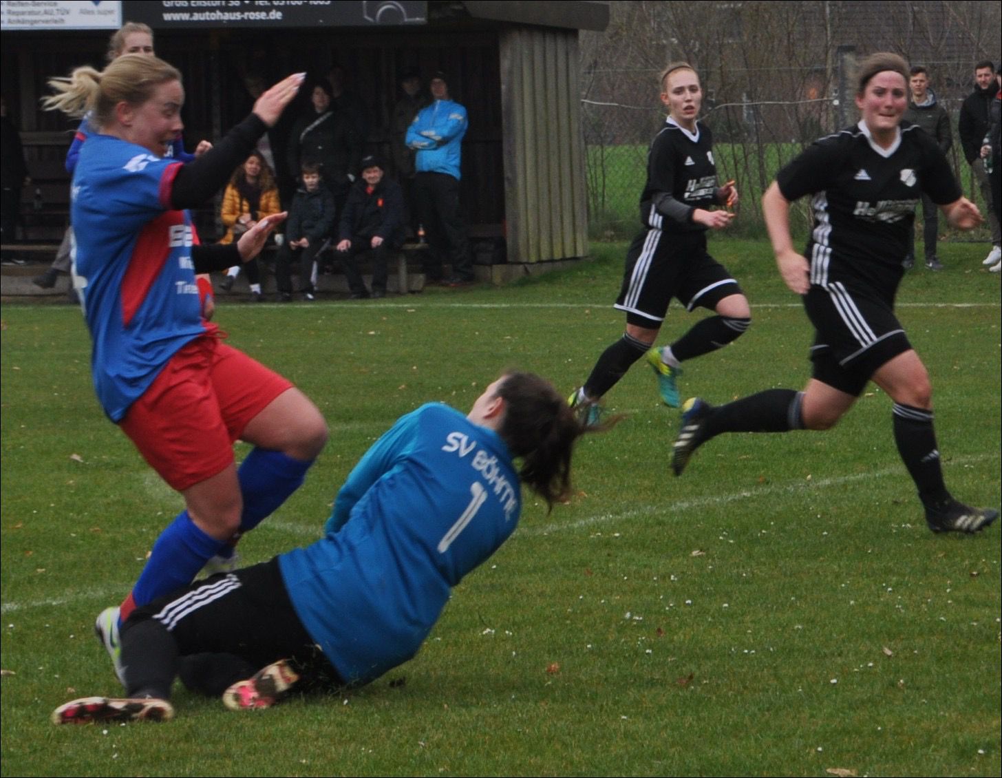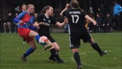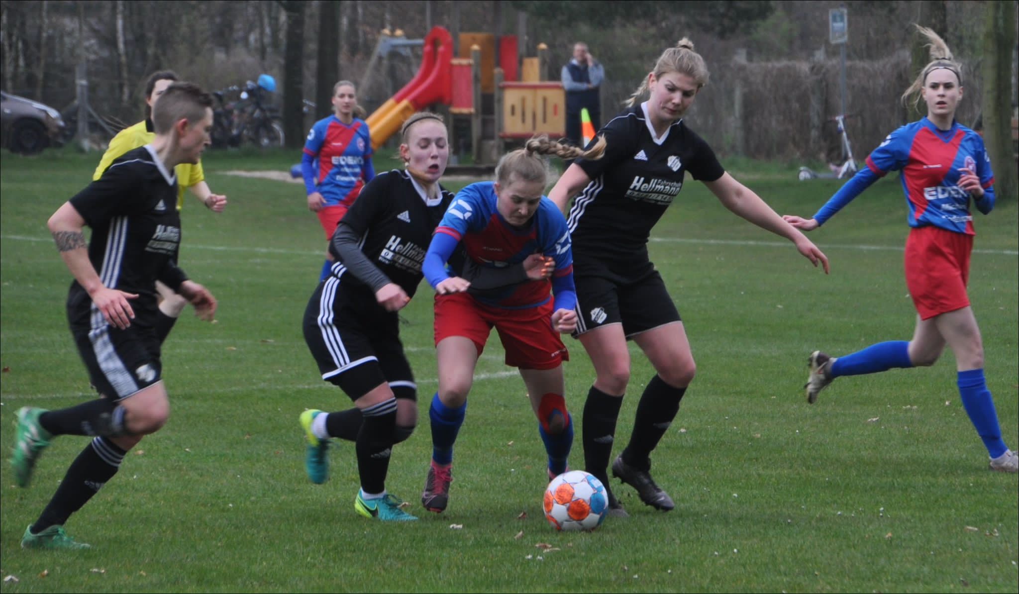Von der ersten bis zur letzten Minute zeigten die Mannschaften, durch einen hohen spielerischen und vor allem kämpferischem Einsatz, dass beide Duellanten einen „Dreier“ als Ziel ausgegeben haben. Die Spannung im Spiel war in jeder Minute zu spüren und gerade für die zahlreich anwesenden Zuschauer entwickelte sich, bei kaltem Wetter und einem tiefen, aber bespielbarem Untergrund, ein gut anzusehendes Frauenfußballspiel. Wie eigentlich schon gewohnt in unseren Heimspielen, konnten wir einen guten und schwungvollen Start verzeichnen. Ein hohes Pressing und Anlauf durch unsere Offensivkräfte führt bereits nach vier Minuten zu einem Ballgewinn und dem daraus folgenden Führungstreffer. Die Gäste spielten, wie uns noch deutlich aus dem Hinspiel bekannt und daher auch in dieser Partie zu erwarten war, ihren Spielaufbau nach Ballbesitz durch die Torfrau, grundsätzlich durch Kurzpassspiel über ihre Außenverteidigerinnen und ihrer Torfrau. Diese Tatsache konnten wir, wie auch schon im Hinspiel mehrfach geschehen und gelungen, damals haben wir dadurch zwei Treffer erzielen können, durch ein hohes Pressing und schnelles Zustellen der Anspielmöglichkeiten, zur Balleroberung nutzen. Eine dieser ersten Ballgewinne konnte Toni dann durch ein Tor von der rechten Seite ins obere linke Toreck nutzen. Im Verlaufe der 1. Halbzeit kamen wir dann immer wieder zu guten Spielzügen, schafften auch mehrere 1:1 Situationen mit der Gästetorfrau herauszuspielen, konnten die bis dahin jedoch verdiente Führung nicht weiter ausbauen, so ging es, aus Sicht des SVB, nur mit einem 1:0 in die Pause.