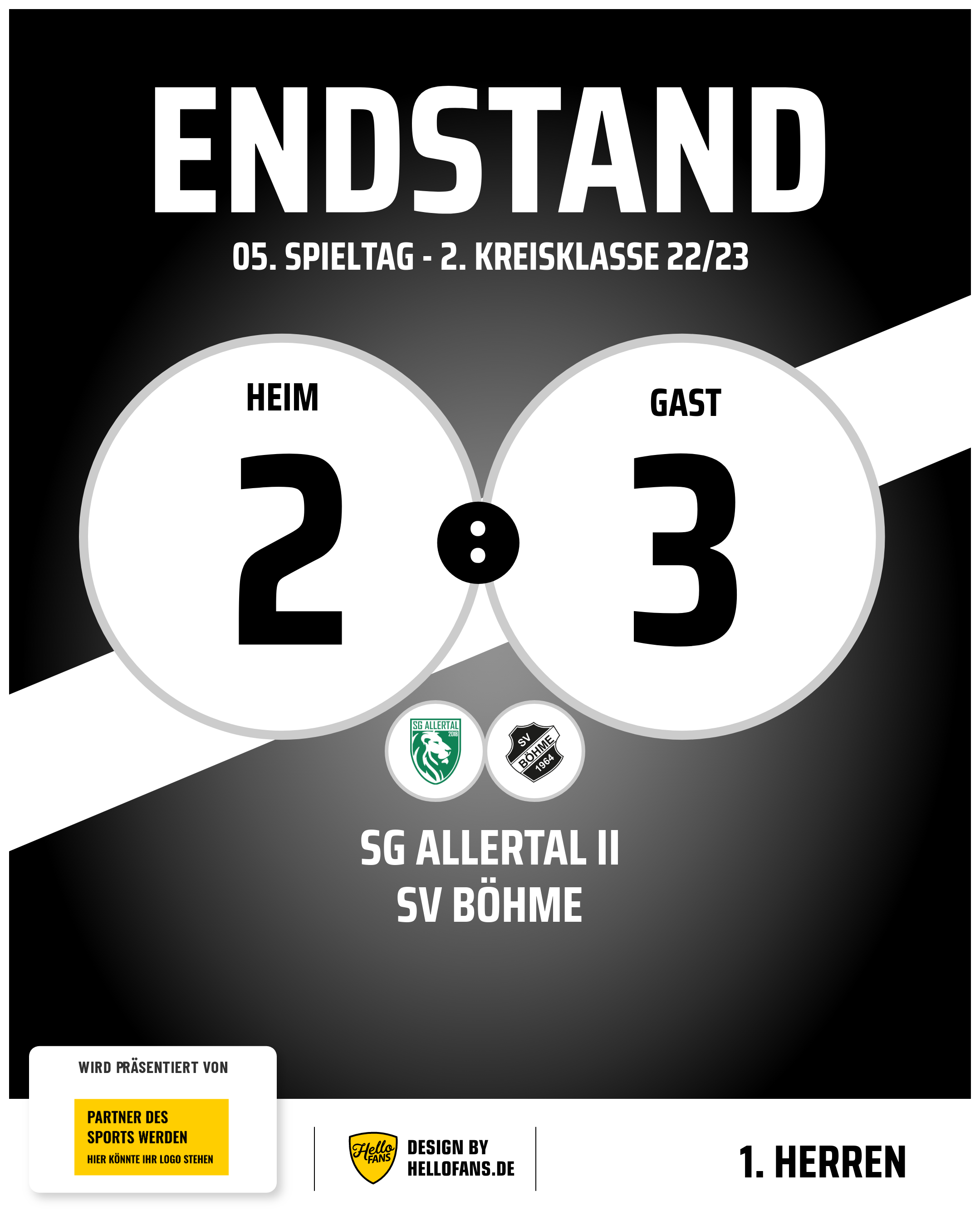 In der 75. Minute ging der SV Böhme etwas glücklich mit 2:1 in Führung. Stürmer Dominik Hibbing stand nach einem Konter plötzlich frei vor dem Allertaler Torwart und vergab zunächst, doch der mitgelaufene Michel Marquardt schnappte sich den Abpraller und legte erneut auf Dominik Hibbing quer, der im zweiten Anlauf die Kugel über die Linie drückte.