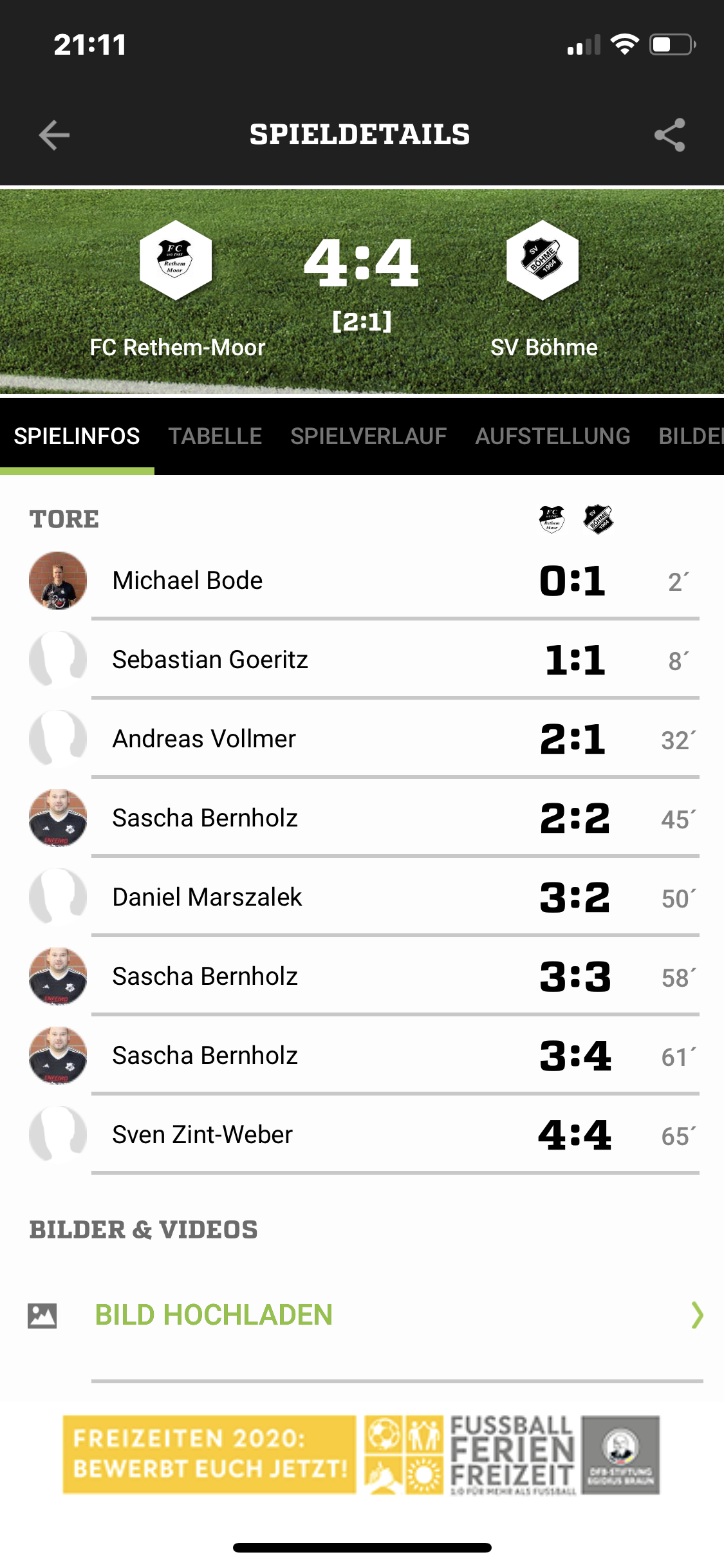 Bei bestem Fußballwetter trafen beide Mannschaften am Sonntag aufeinander. Es regnete permanent 70 Minuten durch, sodass der Ball schnell lief und auch die Spieler einen heidenspaß hatten. Als neu eingekaufter Spieler wurde Sascha Bernholz begrüßt! Wie so oft, war auch dieses Mal kein Schiedsrichter erschienen. Dafür pfiff Herr Evers aus Rethem Moor eine gute Partie.In der 2. Minute kam der Ball zu Michale Bode (Mocco für alle Insider), er nahm am 16ner der Moorer maß und schoss den Ball mit der Pieke gegen den linken Innenpfosten. Von dort sprang er an den rechten Innenpfosten und kullerte ins Tor. 0:1 für Böhme!! Die Moorer waren nur kurz geschockt und glichen in der 8. Minute aus. Leider verletze sich Steffan Voss am Oberschenkel in der 15. Minute. Für ihn lief nun Andreas Blume auf. In der 33. Minute brachte Andreas Vollmer die Moorer in Führung und mit dem 2:1 ging es dann auch in die Pause. Zu Beginn der zweiten Halbzeit startete Marc auf der linken Seite durch, brachte den Ball scharf vor das Tor auf den einlaufenden Gerd Meyer. Doch dieses Mal verpasste er im Gegensatz zur letzten Woche den Ball um Schamhaaresbreite. Grund dafür war, dass der Ball kurz vorm Tor noch einmal auf dem nassen Rasen aufschlug, dadurch noch mal knapp 50 km/h mehr an Fahrt aufnahm und Gerad über die Spitze des Kaiserschuhs rutschte. In der 45. Minute begann die Stunde von Sascha Bernholz, oder wie wir nun sagen „Die Legende“. Das Spielgerät kam im Gewusel des 16ners zu Sascha, dieser nahm sich ein Herz und einen harten Schuss, haute den Ball mit Wucht direkt hart oben rechts ins Tor, 2:2 der Ausgleich. Wieder gingen die Moorer in der 50. Minute mit 3:2 in Führung. In der 50. kam dann auch Sinisa Klauderotti für Mathias (Tacki) Tack. Die Böhmer liefen weiter an, in der 58. Minute ein Freistoß direkt am 16ner. Sascha schnappte sich die Pille und lief an. Ein harter flacher Schuss und der Ball schlug unhaltbar unten links ein. 3:3, Böhme hatte wieder ausgeglichen. In der 61. Minute an gleicher Position ein Freistoß für Böhme, wieder trat Sascha an. Ein wunderschöner Schuss direkt oben links in den Winkel, wie gemalt schlug er unhaltbar ein. In seinem ersten Spiel für die Alte Herren des SV Böhme macht Sascha Bernholz sein drittes Tor, eine unglaubliche Geschichte. Danach glichen die Moorer in der 65. Minute noch aus, der 4:4 Endstand ging für beide Mannschaften in Ordnung. Die Böhmer Alten Herren haben bei Hamburger Schietwetter eine starke Leistung abgeliefert und eine starke Moral gezeigt.