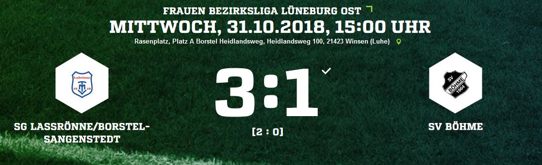 Diese Partie war fast eine exakte Kopie des Spiels aus Eldingen, vom vergangenen Sonntag. Auch in Laßrönne kam der SVB nicht richtig in Schwung und sah sich vorerst dem guten Spiel der Gastgeberinnen gegenüber, die eine deutliche Feldüberlegenheit und ein sicheres Passspiel zeigten, erst nach 30 Minuten konnte das Spiel ausgeglichener gestaltet werde. Wie gegen Eldingen konnte der Gegner aber bis dahin 2 Tore erzielen, das auch verdient. Nach der Halbzeitpause agierte Böhme zielstrebiger, aggressiver und auch viel präsenter auf dem Platz und drängte auf den Anschlusstreffer, in diese Phase hinein fiel dann der etwas unglückliche 3 Gegentreffer, nach einem „Gewühl“ an der 5-Meter-Grenze. Die SG konterte weiterhin immer wieder gefährlich, scheiterte jedoch letztlich auch immer wieder an unserer guten SVB-Torfrau Pia, die ein gutes und fehlerfreies Torwartspiel zeigte, trotz der Gegentreffer, an denen sie keine Schuld hatte. Auch wenn Böhme, in Persona von Kamilla, nach 60 Minuten den verdienten Treffer erzielte, konnten leider keine der nachfolgend herausgespielten Torchancen genutzt werden und so war dieser Sieg der SG Laßrönne letztendlich auch verdient. LBS (Laßrönne/Borstel-Sangenstedt) überholte unsere Frauen durch diesen Sieg in der Tabelle, nur aufgrund des besseren Torverhältnisses und wir rutschten auf Platz 3 ab.