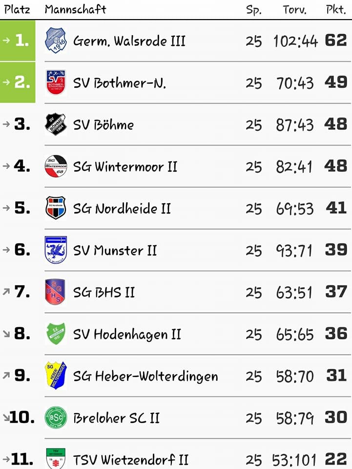 Vor dem letzten Spiel unserer Ersten daheim gegen Heber steht man lediglich 1 Punkt hinter dem SV Bothmer der im letzten Spiel nach Munster reisen muss und auch die Jungs aus Wintermoor rechnen sich noch Chancen auf den ersehnten 2. Tabellenplatz aus.