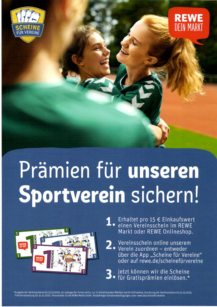 Pro 15 € Einkaufswert in einem Rewe Markt oder im Onlineshop erhaltet ihr einen Vereinsschein. Am Ende der Aktion haben wir die Möglichkeit eure gesammelten Scheinezahlreiche Prämienartikel einzulösen. Die Aktion gilt bis zum 20.12.2020.